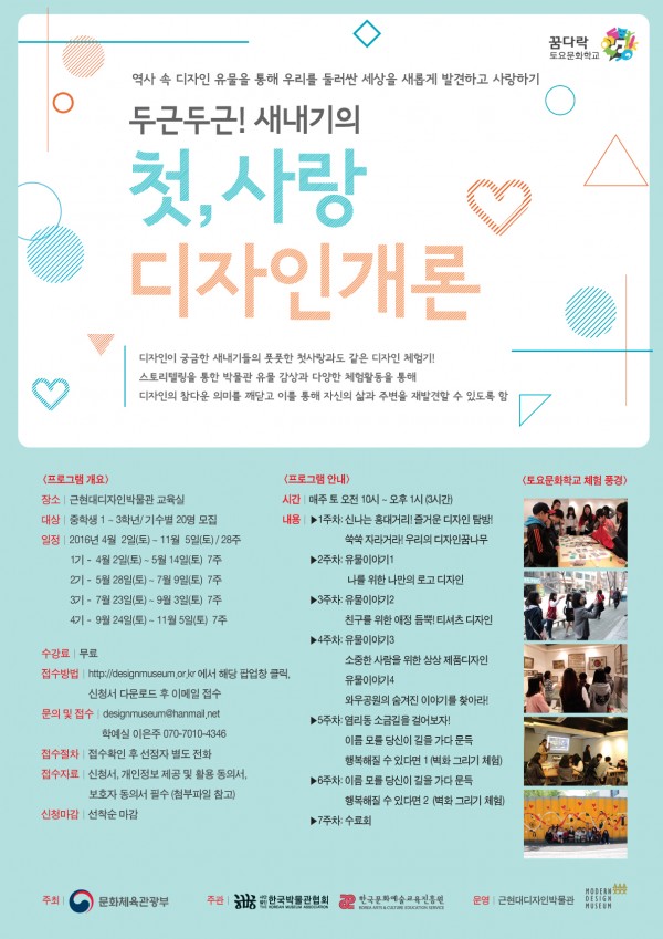 근현대디자인박물관이 주5일제 수업 제도, 자유학기제 등의 전면시행에 따른 토요문화예술체험 강화사업의 일환으로 문화체육관광부가 주최하고 한국문화예술교육진흥원과 한국박물관협회가 주관하는 <2016 꿈다락 토요문화학교 – 도란도란, 나의 박물관 이야기>의 운영기관으로 선정되었습니다.