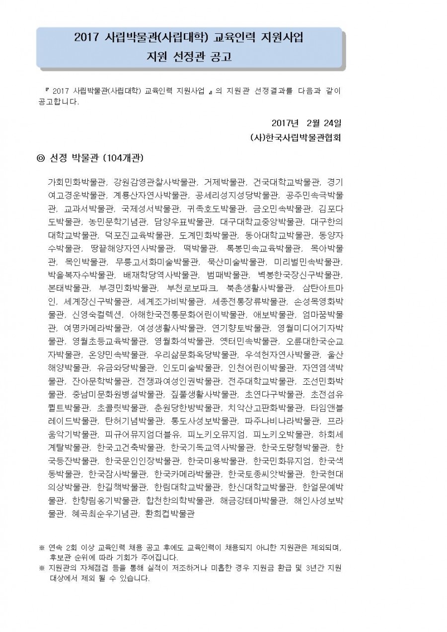 2017 사립박물관(사립대학) 교육인력 지원사업 지원 선정관 공고 페이지 정보 작성자 관리자 작성일17-02-24 19:58 조회42,059회 댓글0건 관련링크 이전글 다음글 목록 본문 댓글목록 등록된 댓글이 없습니다. 이전글 다음글 목록