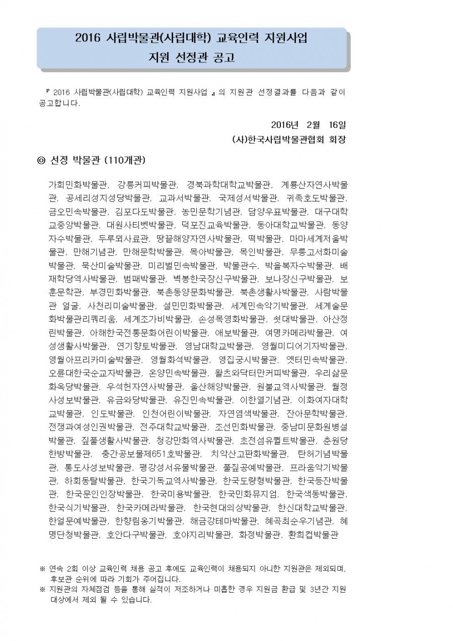 2016 사립박물관(사립대학) 교육인력 지원사업 지원 선정관 공고 페이지 정보 작성자 관리자 작성일16-02-16 19:53 조회42,842회 댓글0건 관련링크 이전글 다음글 목록 본문 댓글목록 등록된 댓글이 없습니다. 이전글 다음글 목록