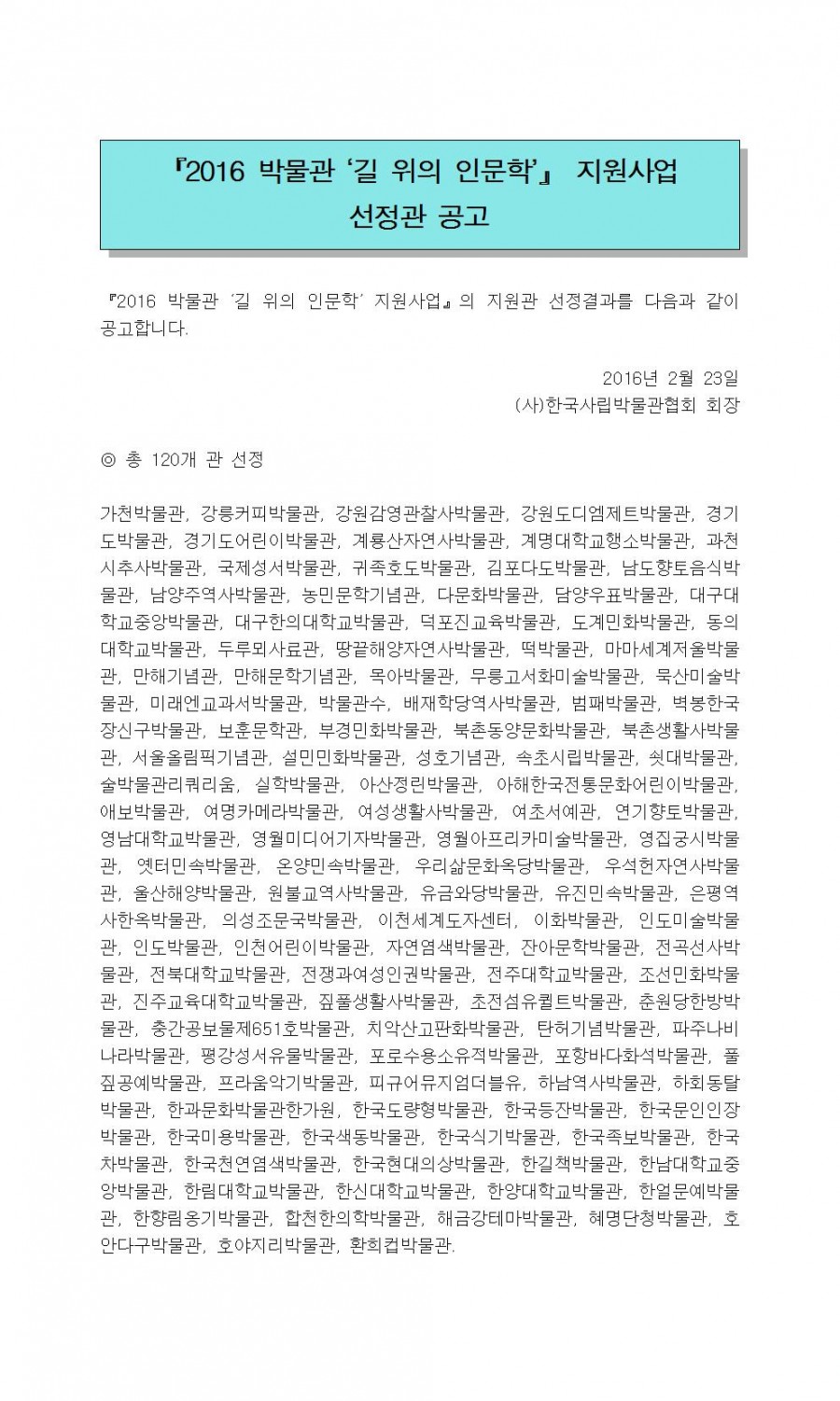 2016 박물관 '길 위의 인문학' 지원사업 선정 발표 페이지 정보 작성자 관리자 작성일16-02-23 17:04 조회42,579회 댓글0건 관련링크 이전글 다음글 목록 본문 댓글목록 등록된 댓글이 없습니다. 이전글 다음글 목록