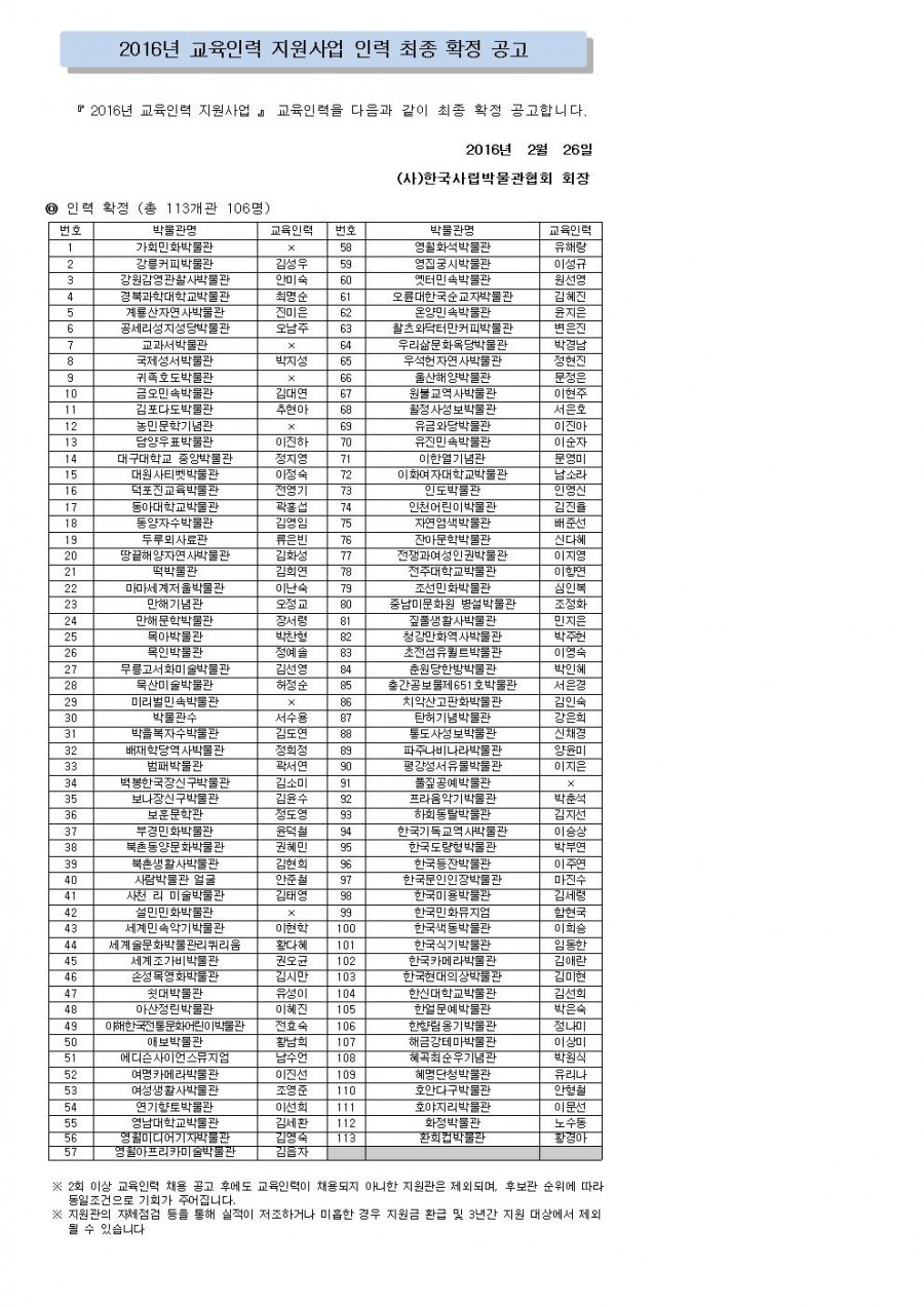 2016년 교육인력 지원사업 인력 최종 확정 공고 페이지 정보 작성자 관리자 작성일16-02-26 19:54 조회43,028회 댓글0건 관련링크 이전글 다음글 목록 본문 댓글목록 등록된 댓글이 없습니다. 이전글 다음글 목록