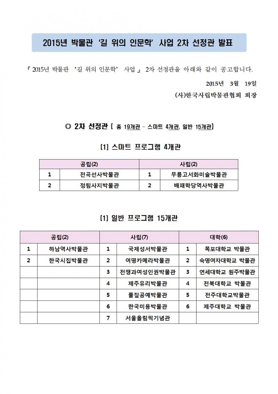 2015 박물관 '길 위의 인문학' 2차 선정관 발표 페이지 정보 작성자 관리자 작성일15-03-19 17:31 조회42,461회 댓글0건 관련링크 이전글 다음글 목록 본문 댓글목록 등록된 댓글이 없습니다. 이전글 다음글 목록