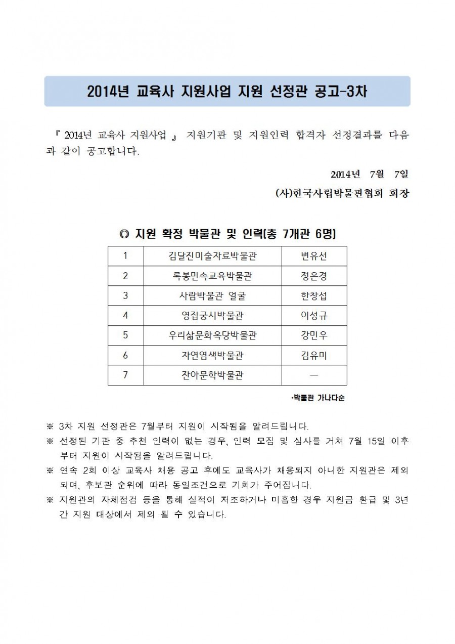『 2014년 교육사 지원사업 』 지원기관 선정 공고 - 3차 페이지 정보 작성자 관리자 작성일14-07-07 14:29 조회40,194회 댓글0건 관련링크 이전글 다음글 목록 본문 댓글목록 등록된 댓글이 없습니다. 이전글 다음글 목록