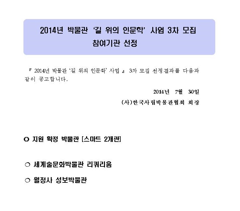 [인문학] 2014 박물관 길 위의 인문학 3차 기관모집 선정결과발표 페이지 정보 작성자 관리자 작성일14-07-30 14:31 조회39,387회 댓글0건 관련링크 이전글 다음글 목록 본문 댓글목록 등록된 댓글이 없습니다. 이전글 다음글 목록