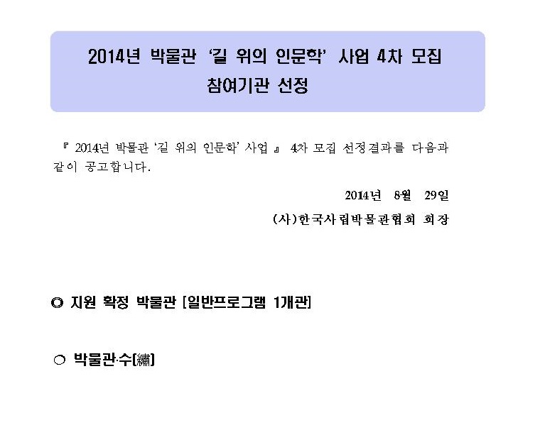 2014 박물관 길 위의 인문학 4차 기관모집 선정결과발표 페이지 정보 작성자 관리자 작성일14-08-29 14:33 조회40,181회 댓글0건 관련링크 이전글 다음글 목록 본문 댓글목록 등록된 댓글이 없습니다. 이전글 다음글 목록