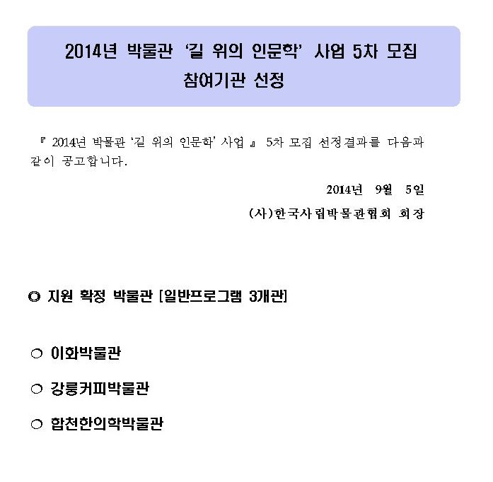 2014 박물관 길 위의 인문학 5차 기관모집 선정결과발표 페이지 정보 작성자 관리자 작성일14-09-05 14:34 조회40,480회 댓글0건 관련링크 이전글 다음글 목록 본문 댓글목록 등록된 댓글이 없습니다. 이전글 다음글 목록