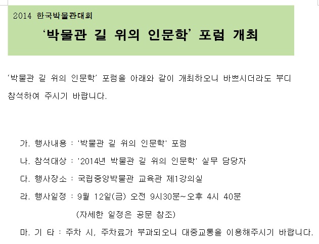 2014 한국박물관대회 '박물관 길 위의 인문학' 포럼 개최 안내