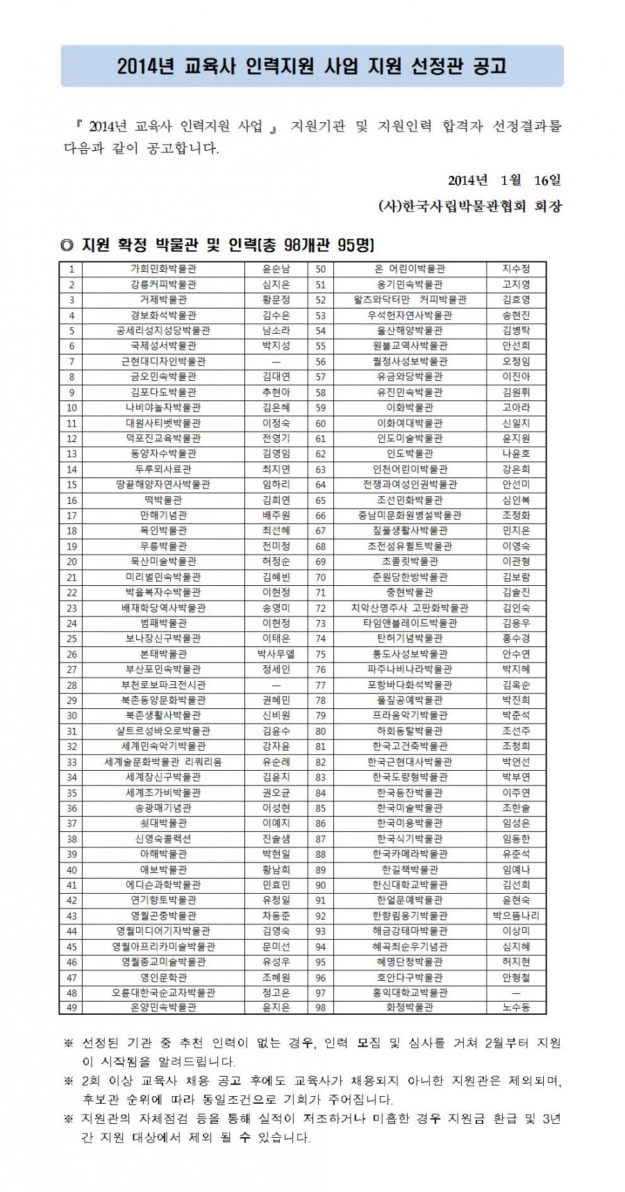 『 2014년 교육사 인력 지원사업 』 지원기관 선정 공고 페이지 정보 작성자 관리자 작성일14-01-16 14:05 조회37,818회 댓글0건 관련링크 이전글 다음글 목록 본문 댓글목록 등록된 댓글이 없습니다. 이전글 다음글 목록