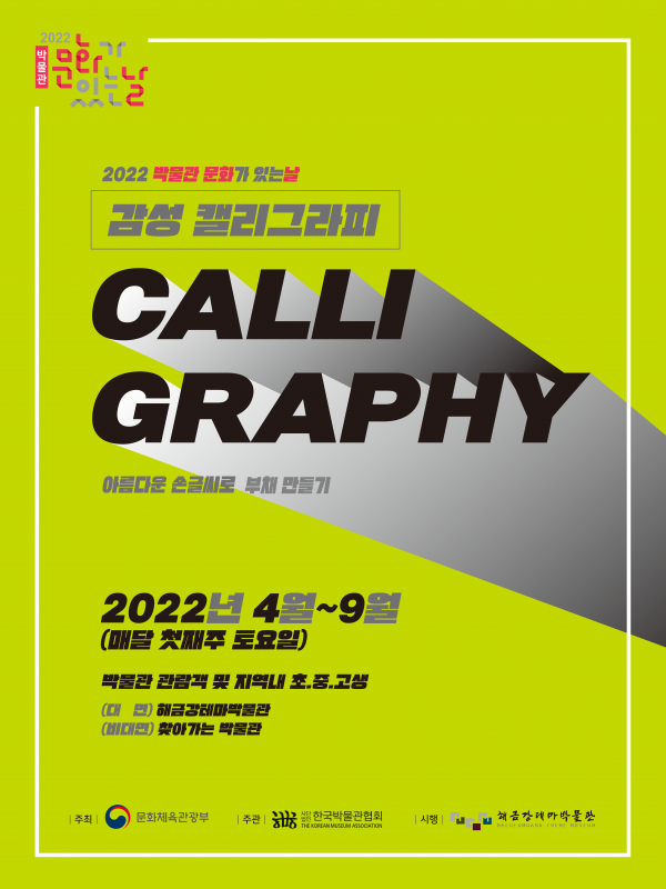 거제 해금강테마박물관은 문화체육관광부에서 주최하고 한국박물관협회에서 주관하는 ‘2022년 박물관 문화가 있는 날’ 사업 수행기관에 선정, 4월부터 오는 9월까지 ‘감성 캘리그라피-아름다운 손글씨로 에코백과 부채 만들기’ 프로그램을 진행한다.